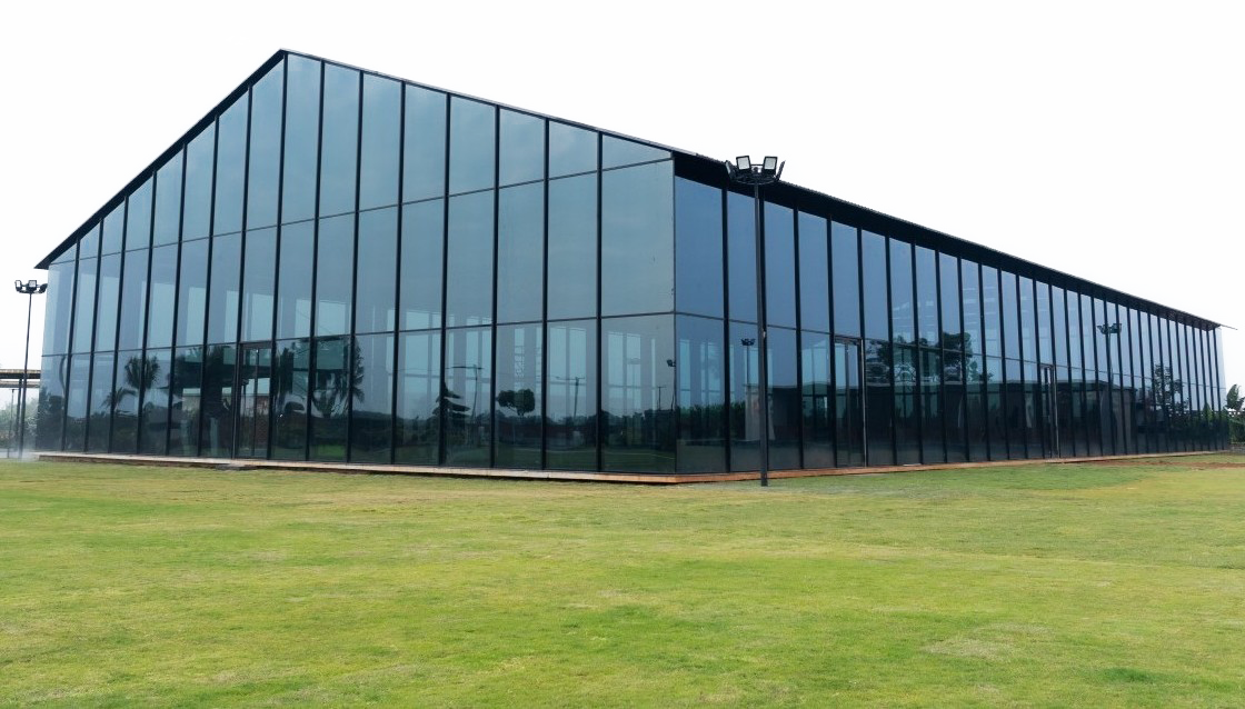 The hall opens to the sky on all sides. The light comes in without effort. The glass keeps the world visible and still feels calm. A quiet space that lets the couple and the family fill it with their own story.